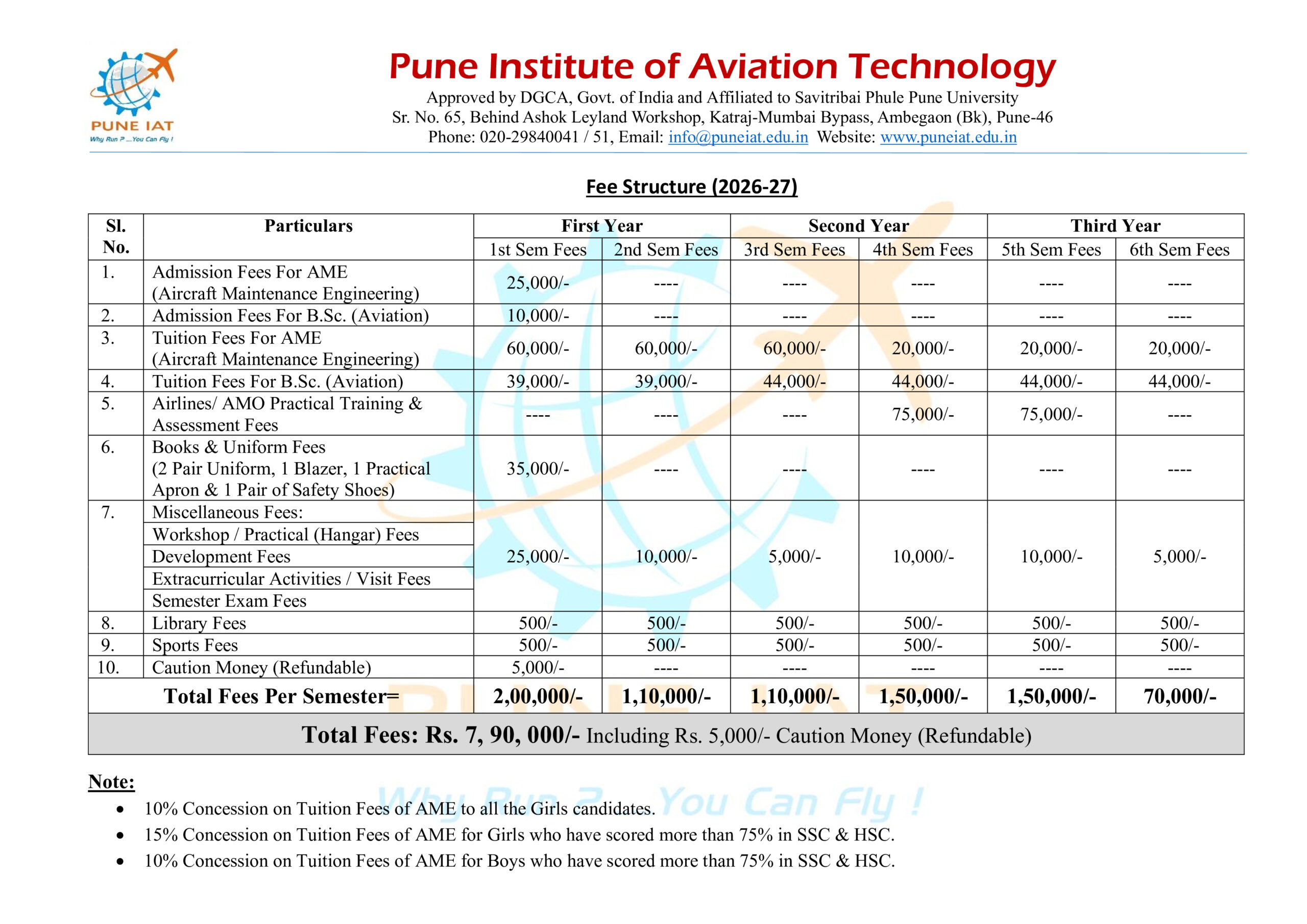 Fee Structure Admission Process Fee Structure Code of Conduct FAQ's About Pune IAT FEE STRUCTURE The aviation course fees in Pune have been determined to enable all students to pursue this course and gain maximum knowledge. For more details on Pune Institute of Aviation Technology fees, kindly check the table below: